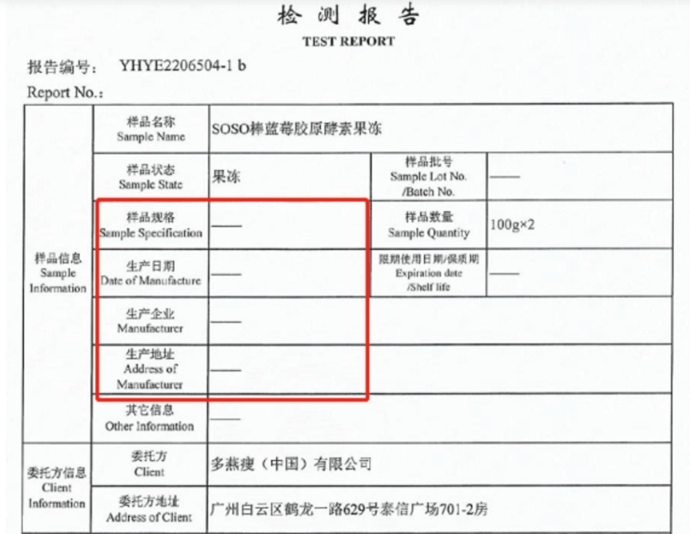 在被爆出安全问题之后,多燕瘦称将产品送检,并出示了一份称并未查出安全问题的检测报告。据黑猫平台信息,多燕瘦公开的检测报告相关重要信息均显示空白,缺失了送检样品的规格、生产日期、生产企业及生产地址等重要数据,可信度较低。