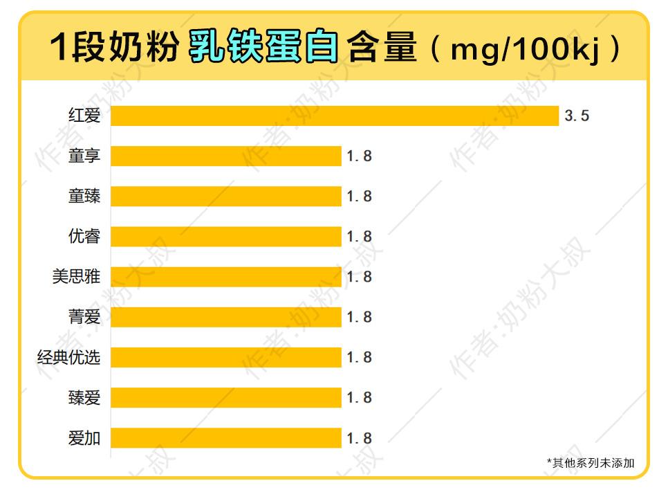 在17个系列的奶粉中,超过一半配方都添加了乳铁蛋白成分,而且添加量排在市售多数奶粉的前列,尤其是红爱3段,含量亦是其他系列的将近2倍,看重乳铁蛋白的可以考虑。