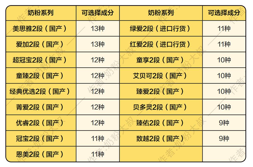 和2段差不多,在可选择营养成分方面,各系列3段奶粉都不同程度添加了9~13种可选择成分,添加种类最多的分别是爱加3段、美思雅3段、菁爱3段、优睿3段、超冠宝3段、童臻3段、经典优选3段。