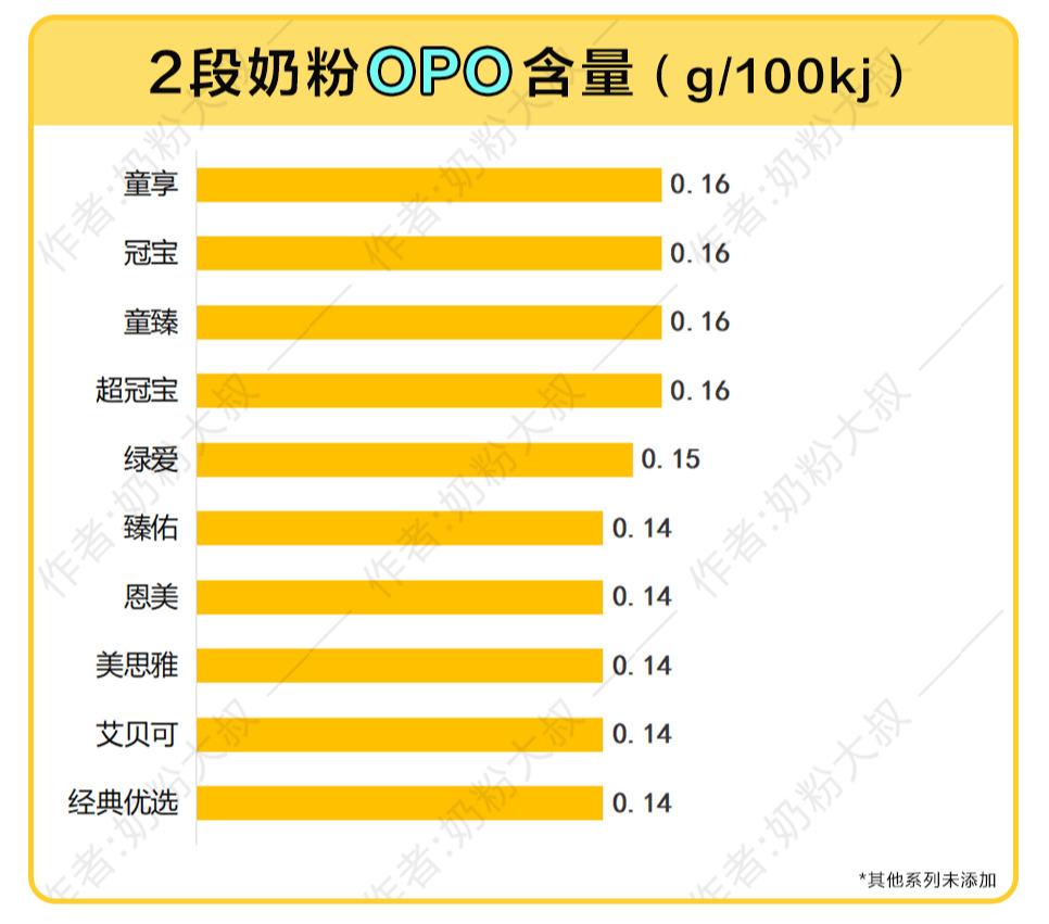 OPO结构脂也叫做1,3-二油酸 2-棕榈酸甘油三酯,如果是容易便秘的宝宝,可以考虑这种配方。市面上所有的配方奶粉大约只有1/3添加了OPO。和1段一样,贝因美这次横评的17个系列奶粉中,只有10个系列配方里添加了OPO结构脂。其中,只有超冠宝2段、冠宝2段、童臻2段、童享2段的含量在市售多数奶粉中排在中上位置。